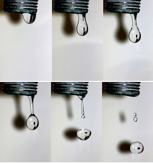 En la siguiente imagen podemos ver que el momento en que una gota de agua tiene la forma de una gota convencional es cuando recién se despega del grifo y comienza a tomar su forma esférica.